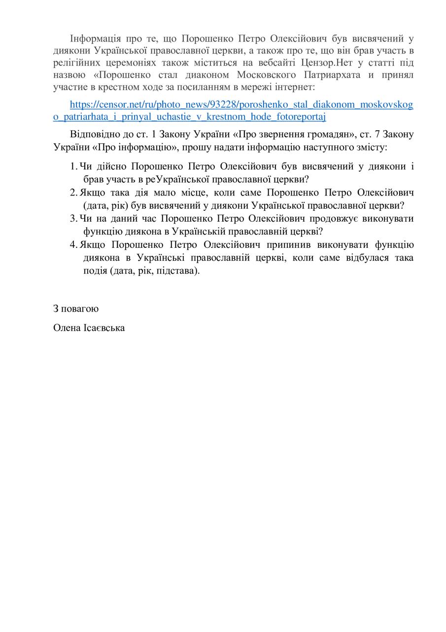 Адвокат Елена Исаевская подала запрос УПЦ с вопросом, был ли Порошенко рукоположен в диаконы церкви.
