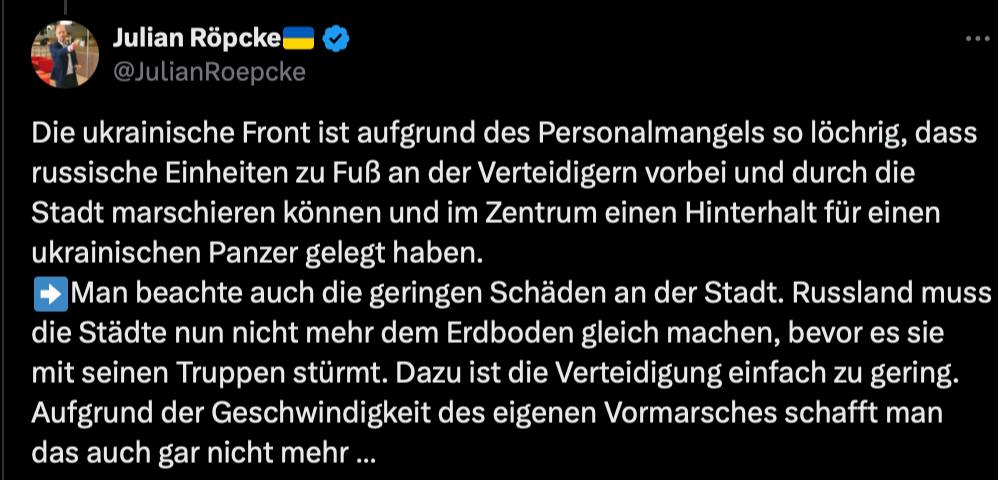 "России больше не нужно сносить города с землей, прежде чем штурмовать их своими войсками. Защита просто слишком слаба для этого. Из-за скорости вашего собственного продвижения вы больше не можете этого делать", - заявил Рёпке, приводя в пример видео боя с украинским танком в неустановленном населенном пункте.