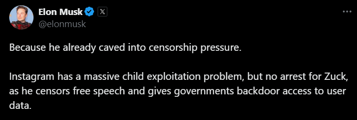 "Потому что он (Цукерберг - Ред.) уже поддался давлению цензуры. В Instagram огромная проблема с эксплуатацией детей, но Цукербергу не грозит арест, поскольку он цензурирует свободу слова и предоставляет правительствам доступ к данным пользователей", - написал Маск.