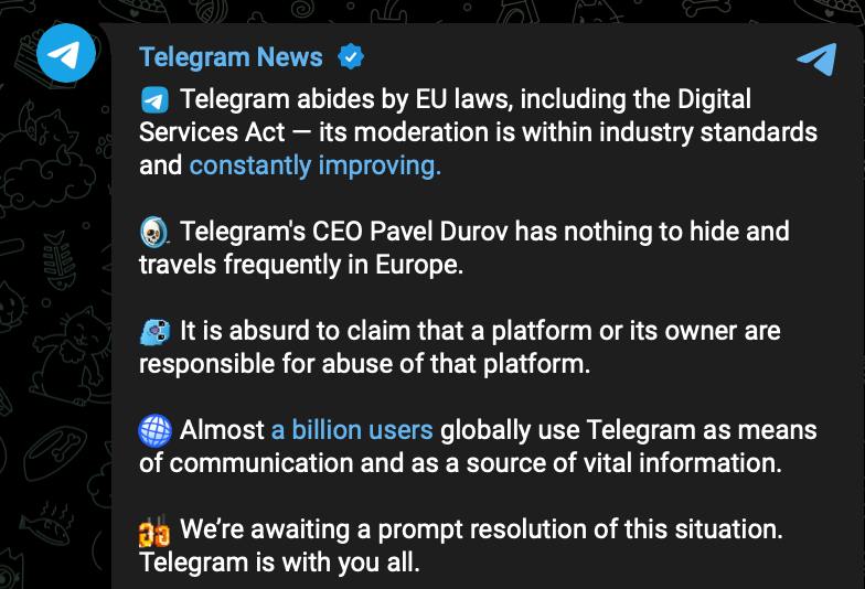 Также сообщается, что Телеграм "соблюдает законы ЕС, включая закон о цифровых услугах - его модерация соответствует отраслевым стандартам и постоянно совершенствуется".