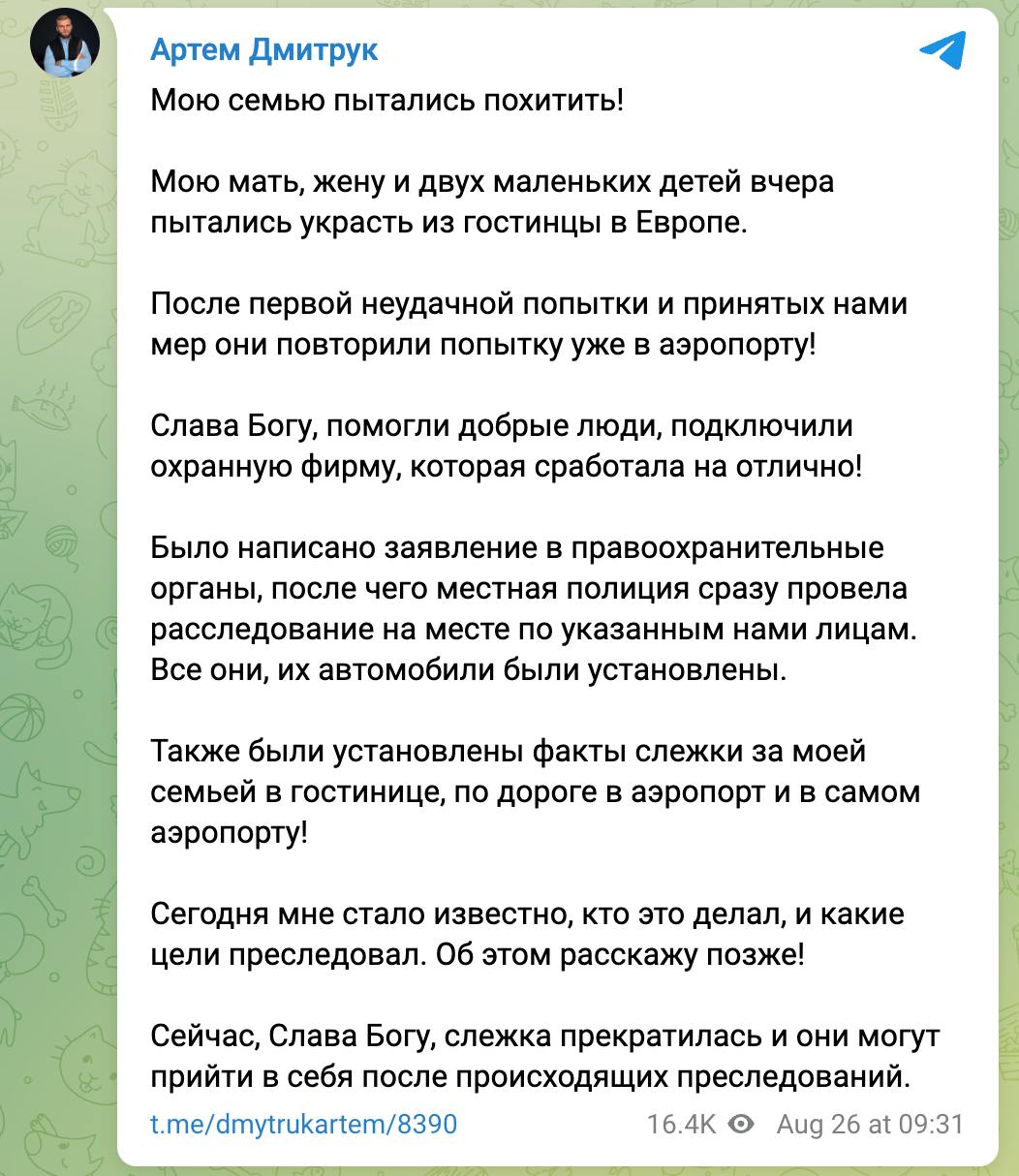"Мою семью пытались похитить! Мою мать, жену и двух маленьких детей вчера пытались украсть из гостиницы в Европе. После первой неудачной попытки и принятых нами мер они повторили попытку уже в аэропорту! Слава Богу, помогли добрые люди, подключили охранную фирму, которая сработала на отлично!" - рассказал Дмитрук.