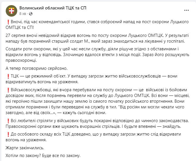 "Ночью, во время комендантского часа, произошло вооружённое нападение на пост охраны Луцкого ОМТЦК и СП! 27 августа ночью неизвестный открыл огонь по посту охраны Луцкого ОМТЦК. В результате нападения был ранен старший солдат М., который сейчас находится на лечении в госпитале. Солдаты роты охраны, которые в это время несли службу, действовали решительно по обстоятельствам и открыли ответный огонь. Преступнику удалось скрыться с места происшествия. Сейчас его разыскивают правоохранители", – пишет ТЦК.
