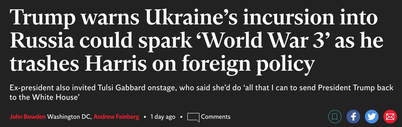 Ранее Трамп заявил, что в случае победы на президентских выборах в США Камалы Харрис может начаться третья мировая война.