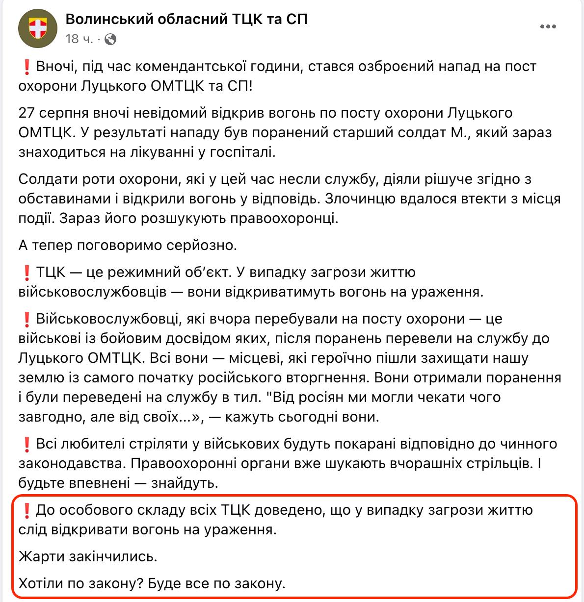 Сотрудники ТЦК будут открывать огонь на поражение в случае угрозы их жизни. Об этом заявляет Волынский ТЦК после вчерашнего нападения на его сотрудников.