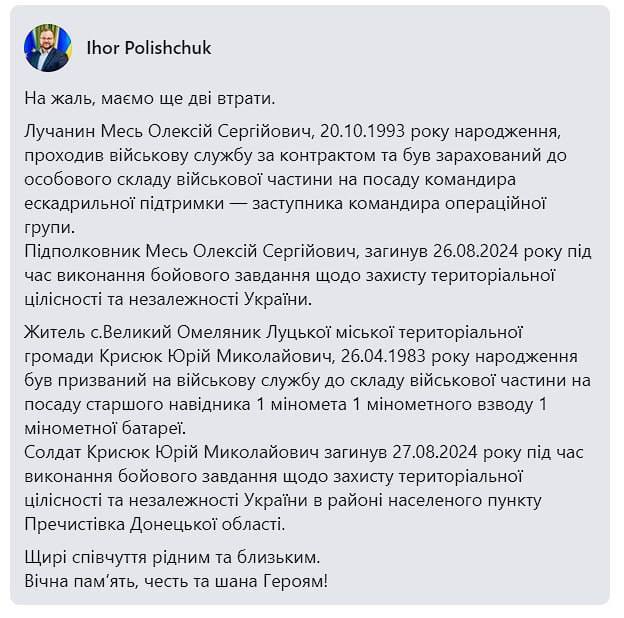 Об этом сообщил в Фейсбуке мэр Луцка Игорь Полищук. Правда, потом он удалил этот пост. Также о гибели информировал Луцкий горсовет.
