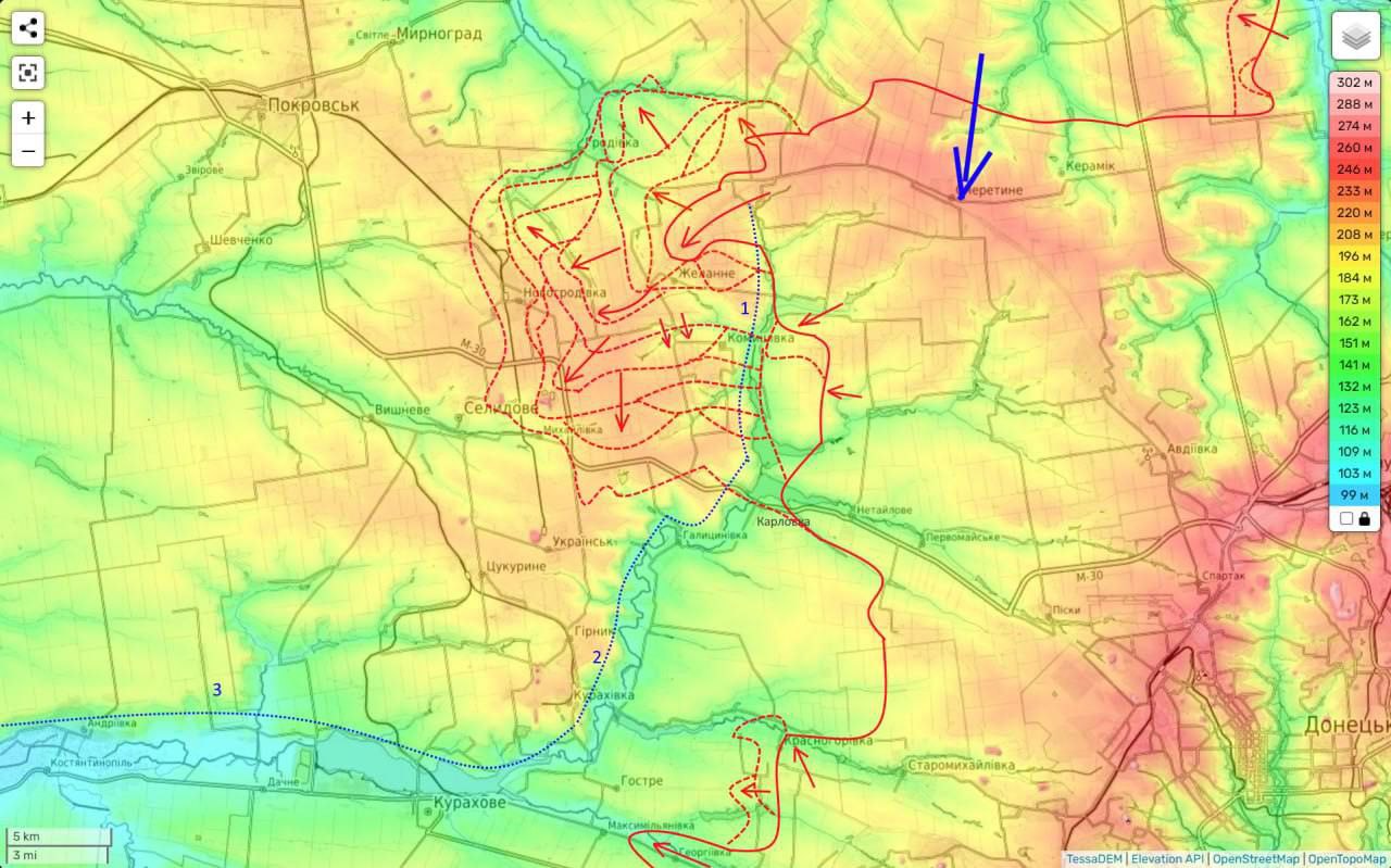 А сегодня известный российский военный блогер Юрий Подоляка высказал предположение, что Украина, "подпуская" российские войска к Покровску и Селидово, готовит удар по флангам наступающей здесь группировки армии РФ: основной удар с севера на Очеретино и вспомогательный с юга.