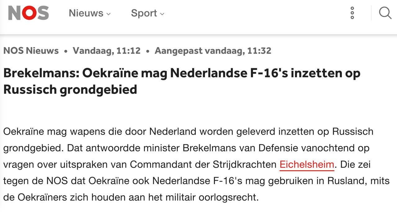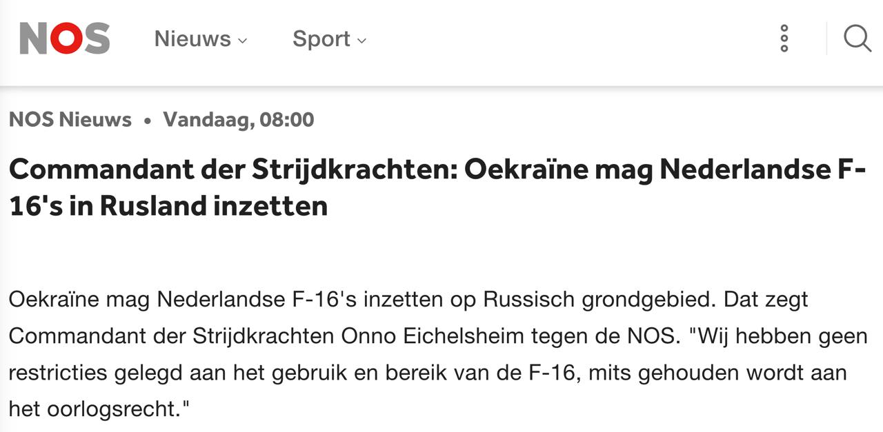 "Мы не вводили никаких ограничений на использование и дальность действия F-16 при условии соблюдения законов войны", - сказал NOS командующий Вооруженными силами страны Онно Эйхельсхайм.