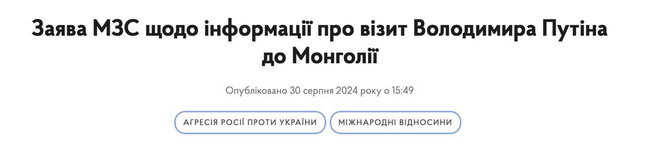 "Украинская сторона надеется, что правительство Монголии осознает тот факт, что Владимир Путин является военным преступником. На его арест выдан ордер Международным уголовным судом, юрисдикция которого признается Монголией. Призываем монгольские власти выполнить обязательный международный ордер на арест и передать Путина в Международный уголовный суд в Гааге", - говорится в тексте.