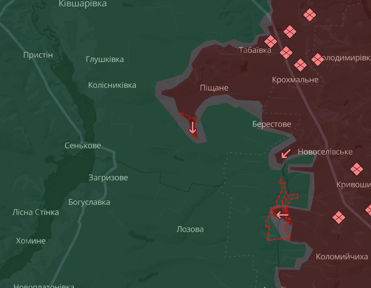 И, судя по конфигурации карты, в РФ могут попытаться вытеснить украинские войска с южного фланга своего наступления к Осколу. Вероятно, встречными ударами со стороны Песчаного и Стельмаховки.