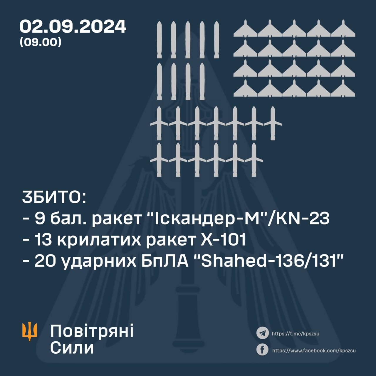 9.28 Воздушные силы сообщают, что ночью сбили 22 ракеты из 35, а также 20 «Шахедов» из 23.