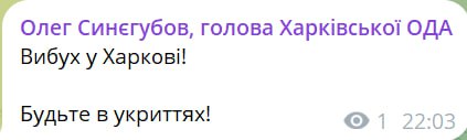 22.05 О взрыве в Харькове сообщает глава ОВА Синегубов.