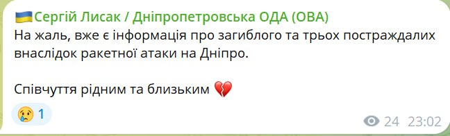23.05 В Днепре один погибший и трое раненых в результате ракетного удара, сообщил глава ОВА Лысак.