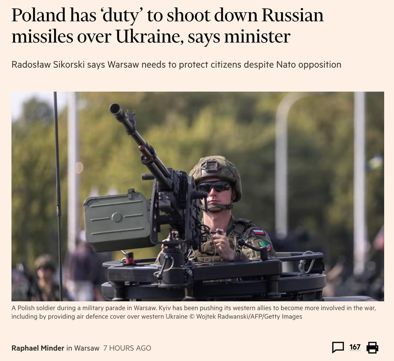 Польша и другие граничащие с Украиной страны обязаны сбивать приближающиеся российские ракеты до входа в небо НАТО (то есть еще над Украиной) несмотря на опасение, что это втянет Альянс в войну.