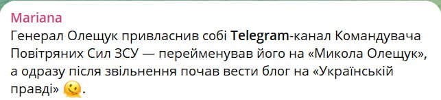 После отставки генерал Олещук присвоил телеграм-канал командующего Воздушными силами ВСУ - Безуглая