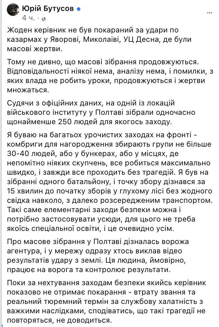 "Судя по официальным данным, на одной из локаций военного института в Полтаве собрали одновременно по меньшей мере 250 человек для мероприятия", - сообщил он.