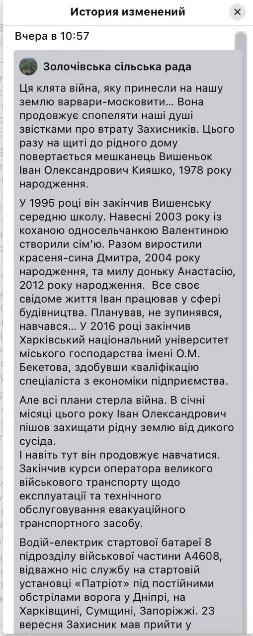 Упоминание о "Пэтриоте" есть в первой версии поста (на скриншоте), затем название удалили, оставив только, что Кияшко был водителем-электриком подразделения ПВО.