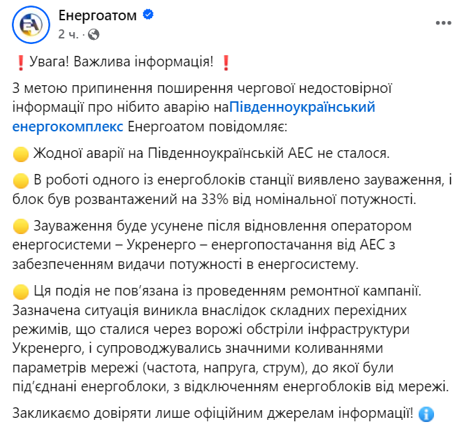 Заявлено, что данная ситуация не связана с ремонтом, а возникла "в результате сложных переходных режимов" из-за российских обстрелов, которые "привели к значительным колебаниям параметров сети (частота, напряжение, ток), к которой были подключены энергоблоки, с отключением энергоблоков от сети".