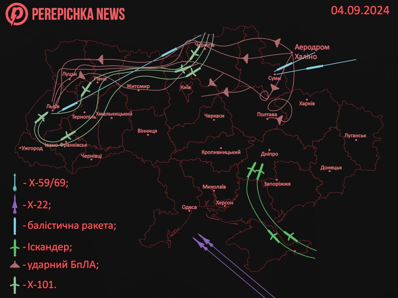 Видно, что основной целью был Львов, но также были удары по пригороду Сум, Одесской области и Кривому Рогу.