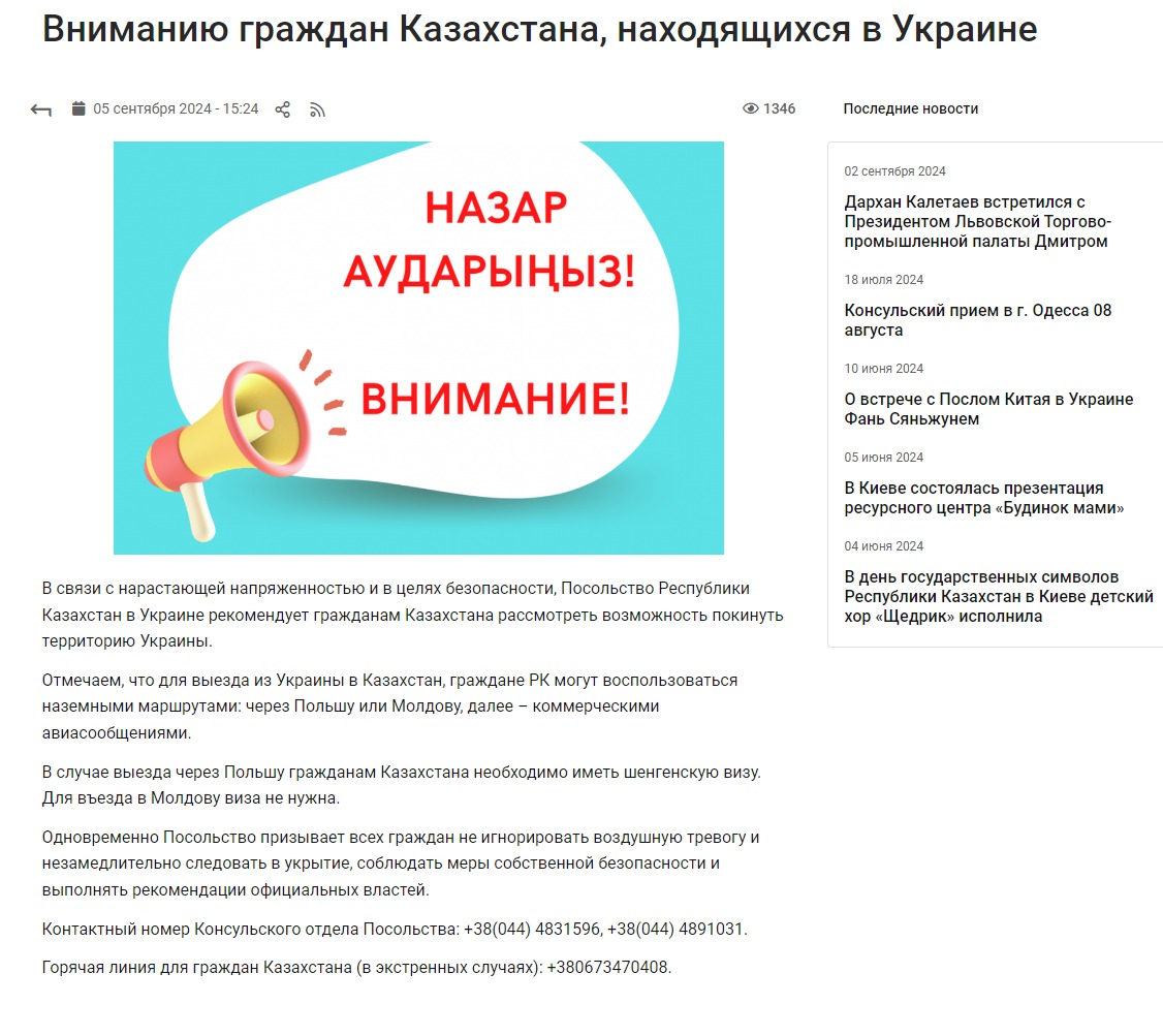 Казахстан рекомендует своим гражданам покинуть Украину в связи с эскалацией напряженности или хотя бы не игнорировать воздушные тревоги.
