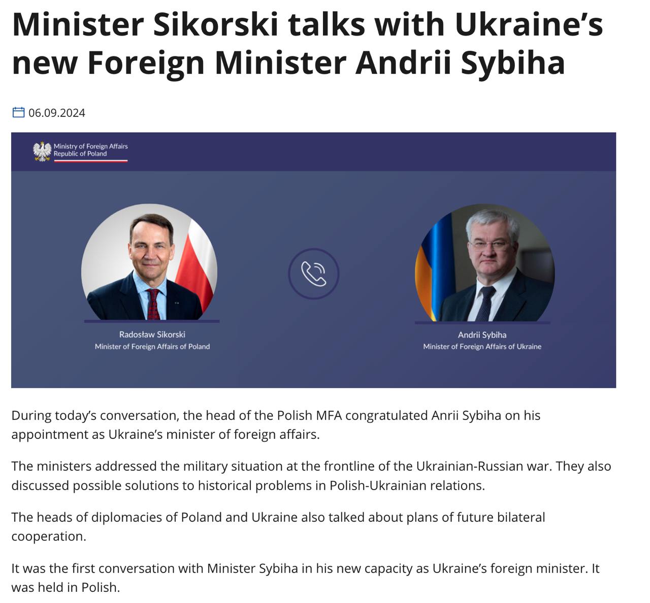 "Глава МИД Польши поздравил Андрея Сибигу с назначением на должность. Министры обсудили военную ситуацию на фронте, а также возможные пути решения исторических проблем в польско-украинских отношениях", - говорится в пресс-релизе.
