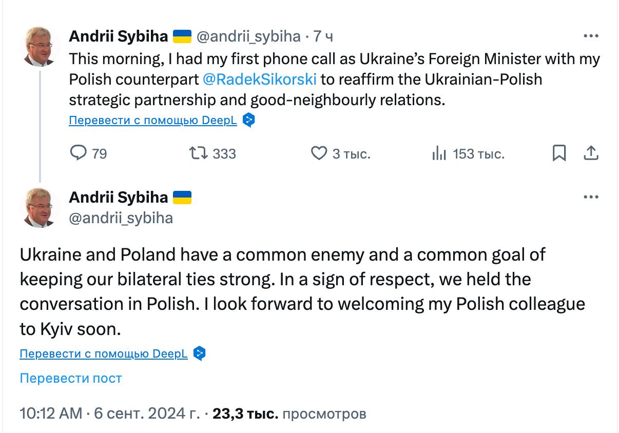 "Сегодня утром у меня был первый телефонный разговор в качестве министра иностранных дел Украины с моим польским коллегой, чтобы подтвердить украинско-польское стратегическое партнерство и добрососедские отношения. У Украины и Польши есть общий враг и общая цель — поддерживать наши двусторонние связи крепкими. В знак уважения мы вели разговор на польском языке. Я с нетерпением жду возможности вскоре приветствовать своего польского коллегу в Киеве", - написал Сибига.