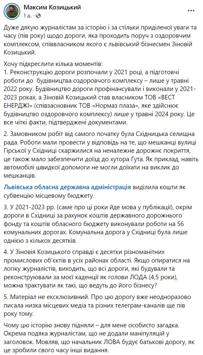 По его словам, реконструкцию дороги начали в 2021 году, а подготовительные работы к строительству оздоровительного комплекса – только в мае 2022 года. Строительство дороги профинансировали и выполнили в 2021-2023 годах, а Зиновий Козицкий стал владельцем гостиничного комплекса только в мае 2024 года.