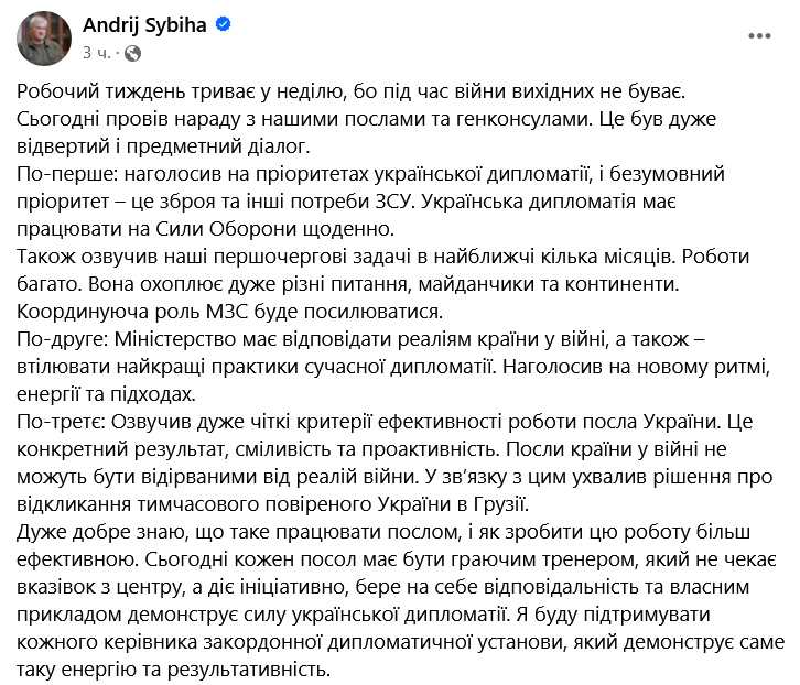 Новый министр иностранных дел Андрей Сибига заявил об отзыве временного поверенного Украины в Грузии.