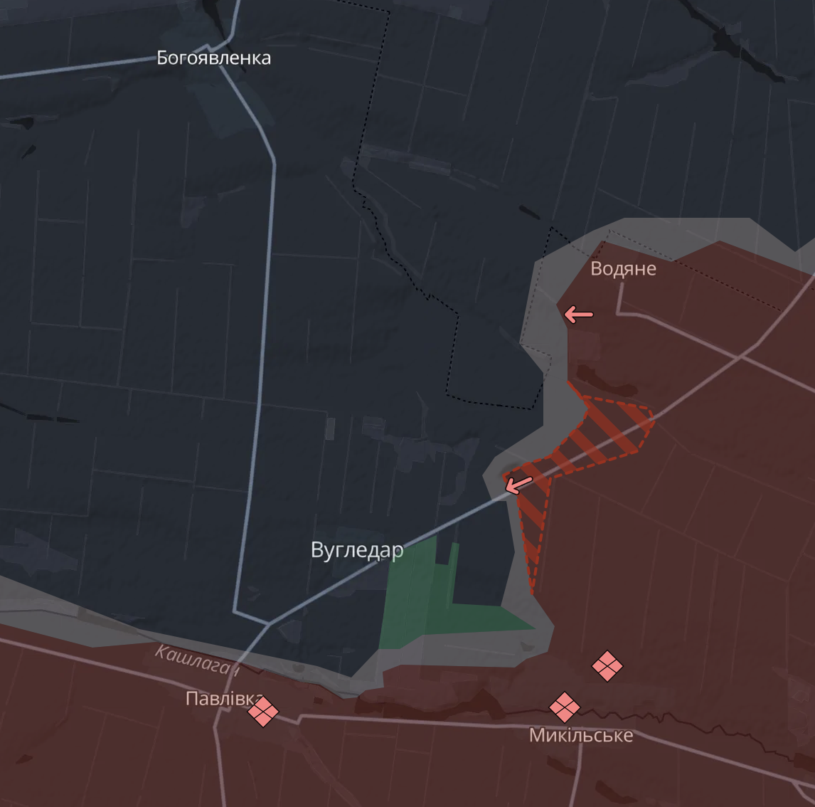 Российские паблики пишут при этом о захвате шахты "Южнодонбасская-1" между Водяным и Угледаром и показали вывешивание своего флага над ее главным корпусом. Также сообщается о начале штурма шахты "Южнодонбасская-3" к западу от Водяного, по дороге в село Богоявленка, через которое снабжается Угледар.