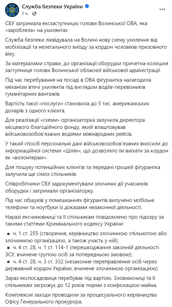 Бывшая заместительница главы Волынской ОВА задержана по подозрению в получении взяток за уклонение от мобилизации.