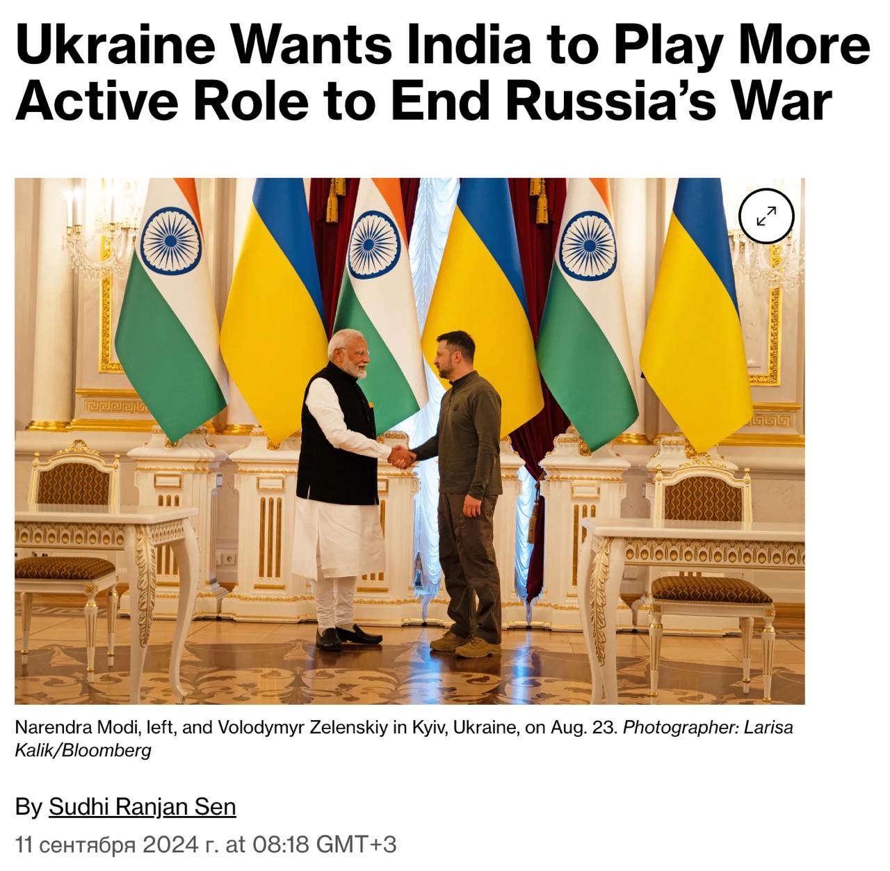 Киев считает, что Индия должна сыграть более "активную роль" в прекращении войны, если хочет получить постоянное место в Совбезе ООН, а не довольствоваться ролью "почтальона, передающего сообщения между Украиной и Россией".