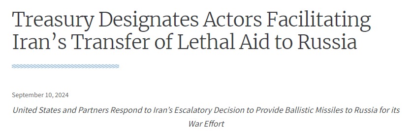 "В ответ на продолжающуюся военную поддержку Ирана России, включая недавнюю поставку баллистических ракет, для агрессивной войны против Украины Управление по контролю за иностранными активами Министерства финансов США (OFAC) вносит в список десять физических и шесть юридических лиц... В конце 2023 года Иран и Россия подписали контракт на поставку сотен ракет. Летом 2024 года российские военные прошли обучение по использованию иранских ракет проекта 360, а по состоянию на начало сентября 2024 года Россия получила первую партию этих ракет из Ирана", - отмечается в пресс-релизе ведомства.
