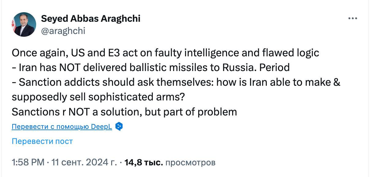 "И снова США и ЕС действуют на основе ошибочных разведданных и ущербной логики - Иран НЕ поставлял баллистические ракеты в Россию. Точка. Приверженцы санкций должны спросить себя: как Иран может производить и якобы продавать сложное оружие? Санкции - это НЕ решение, а часть проблемы", - написал министр иностранных дел Ирана Аббас Аракчи в X.