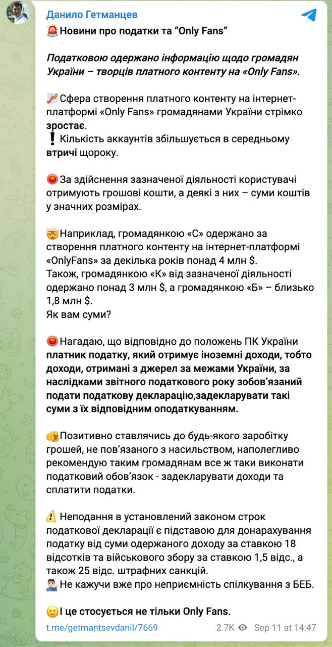 Украинские налоговые органы получили информацию о доходах граждан Украины на платформе эротического контента OnlyFans.