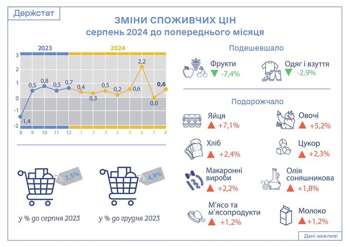 Инфляция в Украине ускорилась до 7,5%. Инфляция на потребительском рынке в августе 2024 года по сравнению с июлем составила 0,6%, с начала года – 4,9%.