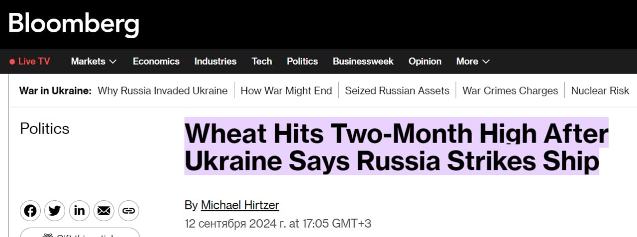 Цена пшеницы достигла двухмесячного максимума после того, как Украина заявила, что Россия нанесла ракетный удар по зерновому судну.