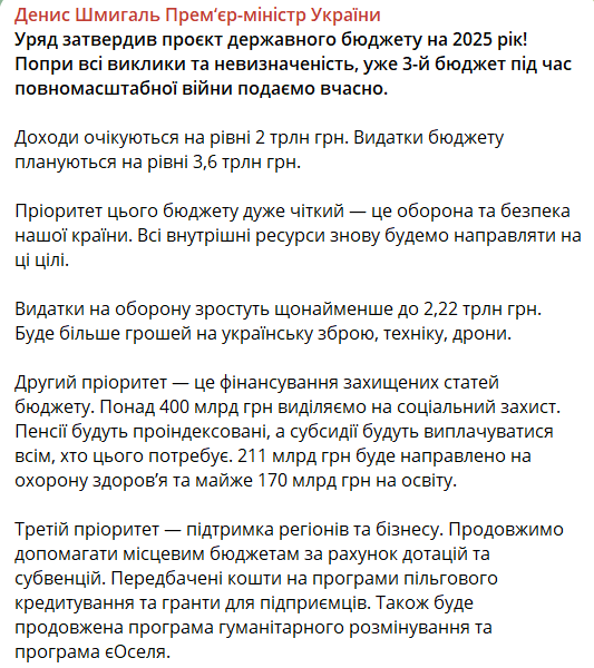 Об этом сообщил премьер-министр Денис Шмыгаль в своем телеграм-канале.
