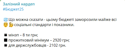 Как пишет нардеп, минимальную зарплату оставили на уровне 8 000 грн, прожиточный минимум — на уровне 2920 грн.