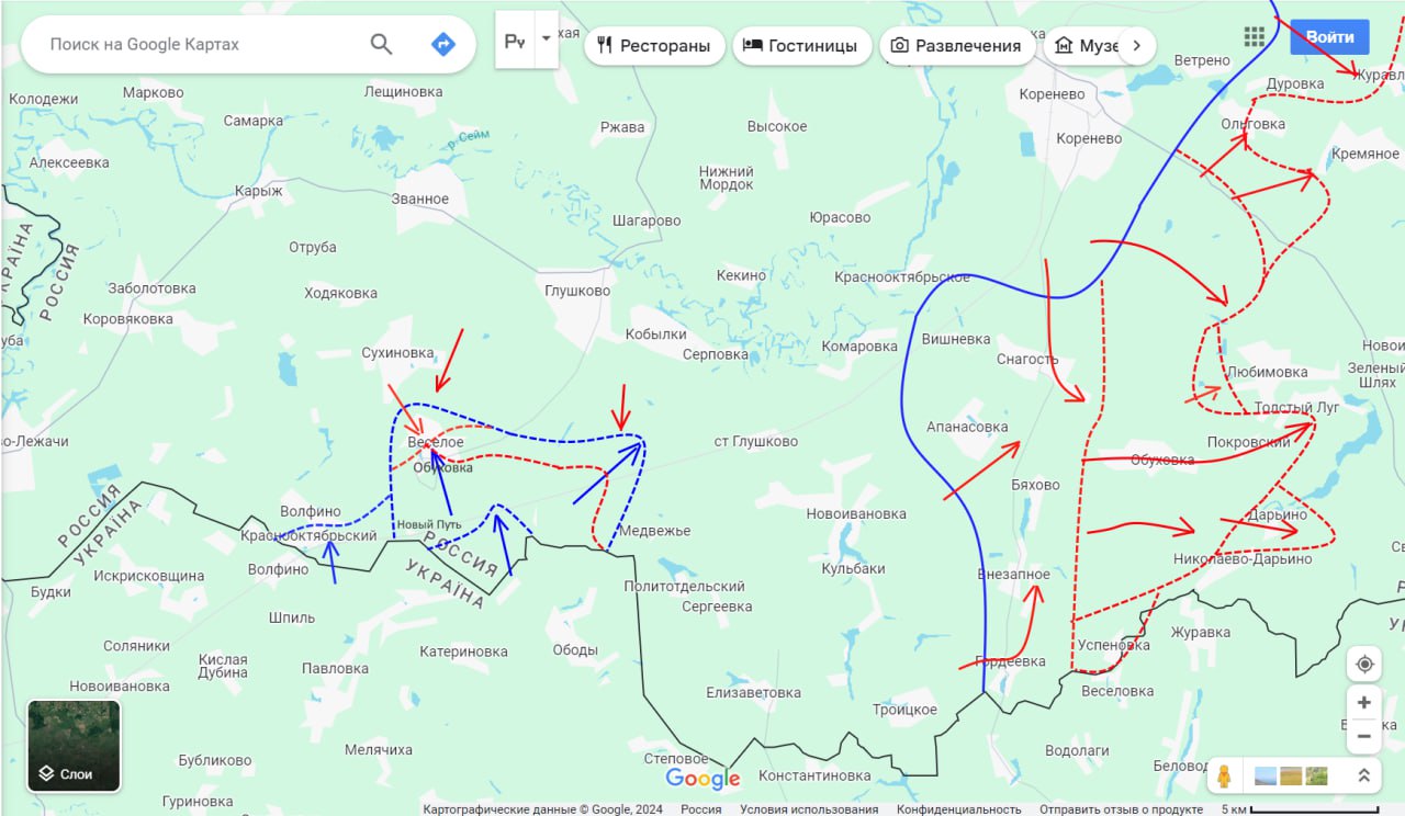 Также они сообщают, что ВСУ продолжают наступление через границу западнее - в Глушковском районе Курской области. По их данным, от населённого пункта Новый Путь ВСУ смогли продвинуться к селу Веселое, за которое идут бои. Паблики пишут, что туда россияне перебрасывают резервы, чтобы сдержать наступление ВСУ. Сегодня часть российских пабликов пишут, что наступление украинских войск там остановлено.