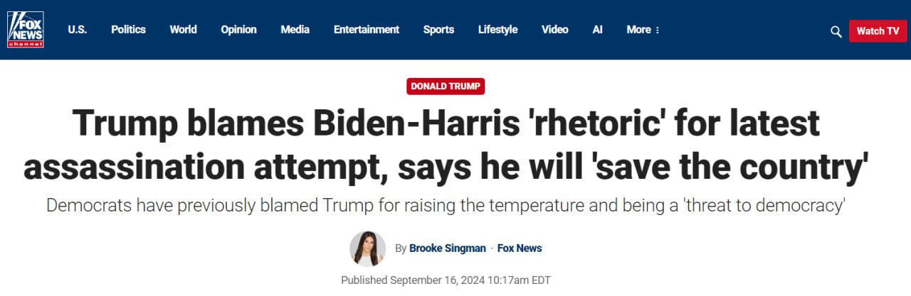 Кандидат в президенты США от республиканцев Дональд Трамп заявил, что действующий глава Белого дома Джо Байден и кандидат в президенты от демократов Камала Харрис несут ответственность за то, что на него совершено второе покушение.