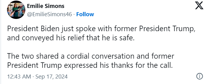 Первый заместитель пресс-секретаря Белого дома Эмили Саймонс опубликовала в социальных сетях сообщение о том, что президент "выразил облегчение от того, что он (Трамп - Ред.) в безопасности".