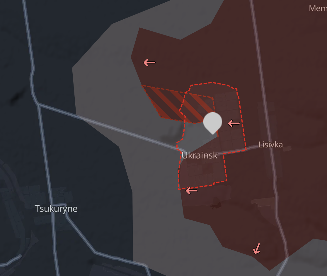 Южнее на грани потери город Украинск - судя по карте Deep State, остался лишь небольшой участок, где идут бои в северо-западной части. Российские паблики вчера заявили, что контролируют уже весь населенный пункт, и показали фото со своим флагом на главном вентиляционном стволе шахты "Украина" - ключевом пункте обороны Украинска.