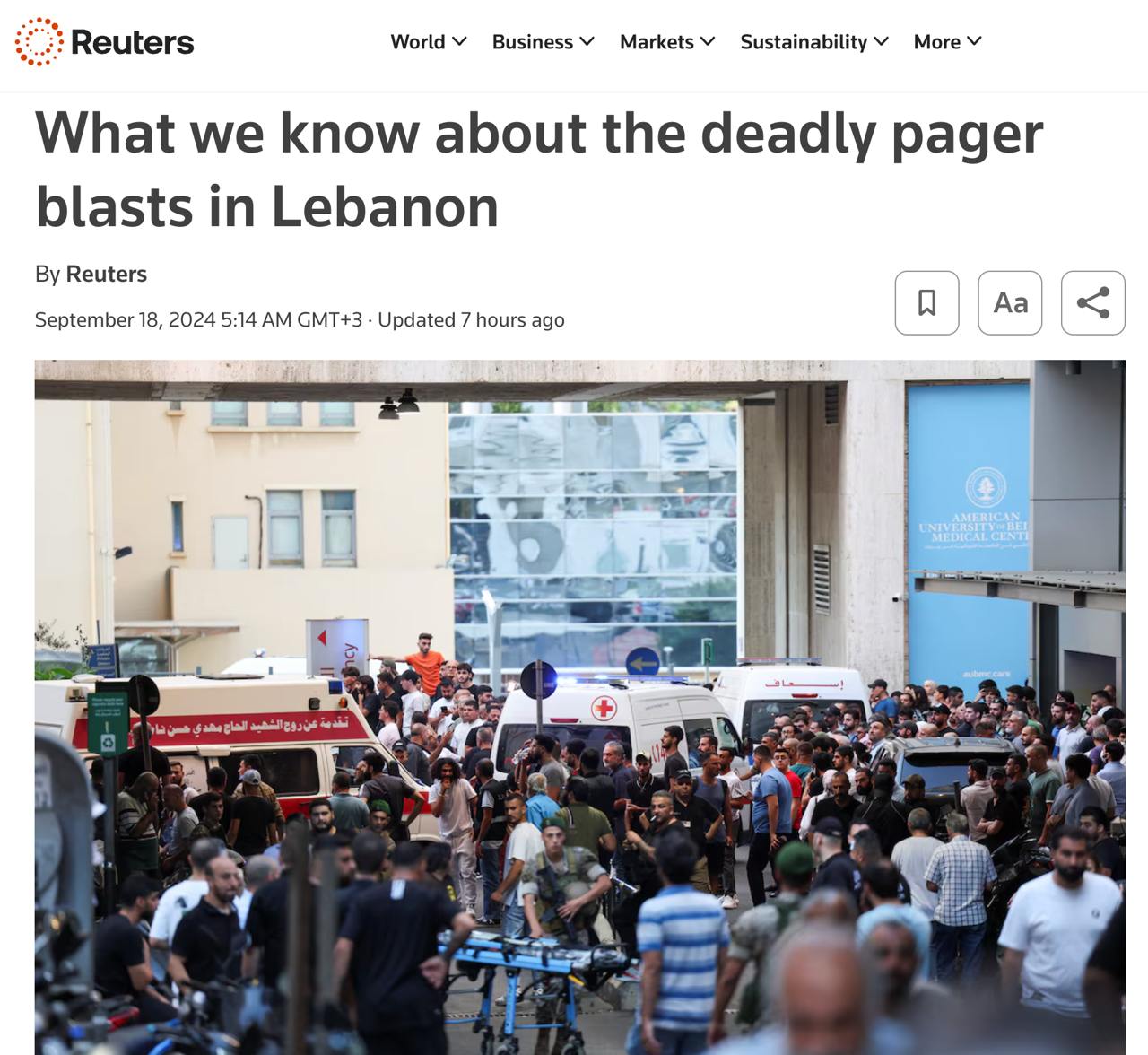 Напомним, вчера в Ливане одномоментно взорвались тысячи пейджеров - убив или ранив представителей "Хезболлы", а также гражданских людей. Число раненых приближается к трем тысячам человек. 11 человек погибли, по даным ливанских властей, из них восемь членов "Хезболлы".