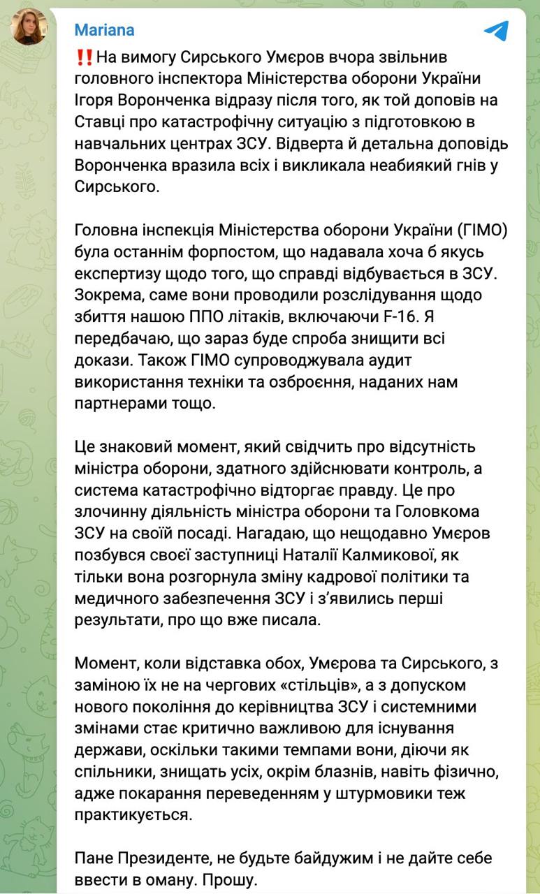 Она пишет, что вчера "по требованию Сырского" Умеров уволил главного инспектора Минобороны Игоря Воронченко.