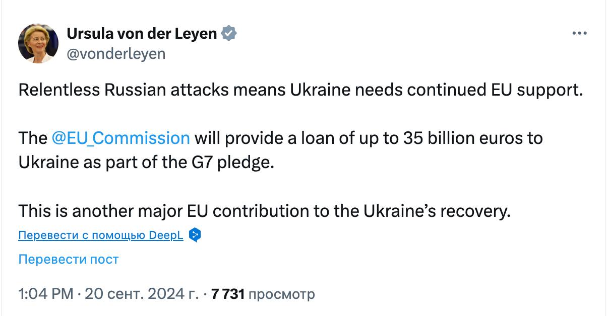13:16 Украина получит кредит на 35 млрд евро от Еврокомиссии, сообщила глава ЕК Урсула фон дер Ляйен.
