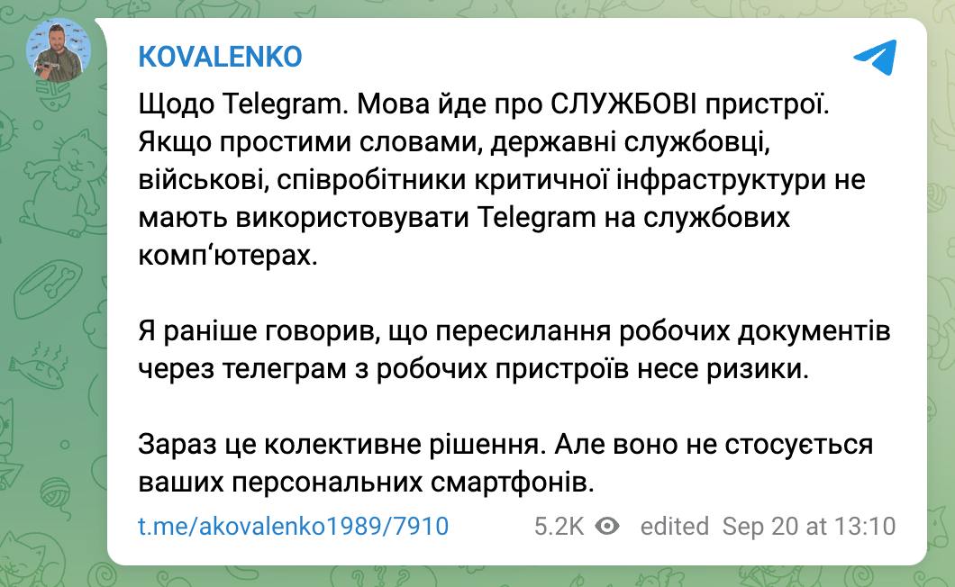 "Было принято решение о запрете установки и использования Telegram на служебных устройствах работников органов государственной власти, военнослужащих, работников сектора безопасности и обороны, а также предприятий – операторов критической инфраструктуры", - говорится в сообщении.