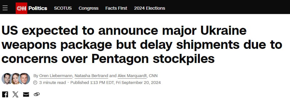 Ранее в CNN сообщали, что США уже несколько месяцев как стали отправлять Украине меньше военной помощи, потому что сократились их собственные запасы, например, 155-мм боеприпасов и ракет для Patriot.