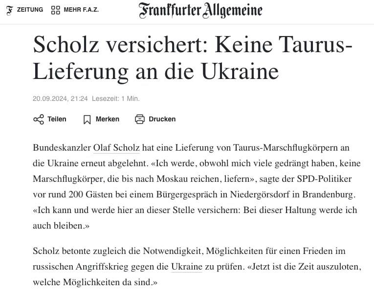 "Хотя многие оказывали на меня давление, я не буду поставлять крылатые ракеты, которые способны долететь до Москвы. Я могу заверить и заверяю здесь, на этом месте: я останусь при этой позиции",— сказал Олаф Шольц на встрече с гражданами в общине Нидергёрсдорф, федеральная земля Бранденбург.