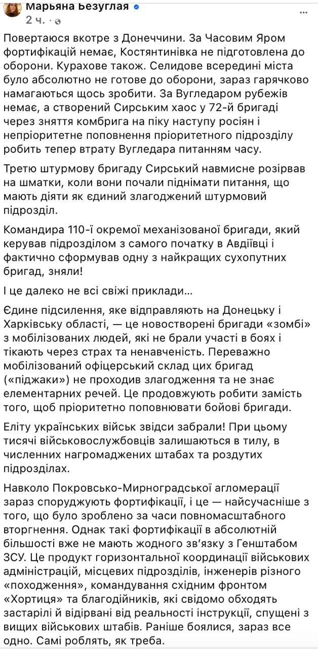 "Возвращаюсь еще раз с Донетчины. За Часовым Яром фортификаций нет, Константиновка не готова к обороне. Курахово тоже. Селидово внутри города было совершенно не готово к обороне, сейчас лихорадочно пытаются что-то сделать. За Угледаром рубежей нет, а созданный Сырским (главком ВСУ - Ред.) хаос в 72-й бригаде из-за снятия комбрига на пике наступления россиян и неприоритетного пополнения приоритетного подразделения делает теперь потерю Угледара вопросом времени", - написала она.