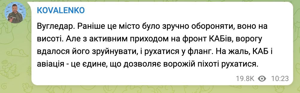 "Раньше этот город было удобно оборонять, он на высоте. Но с активным приходом на фронт КАБов врагу удалось его разрушить и двигаться во фланг. К сожалению, КАБ и авиация - это единственное, что позволяет вражеской пехоте двигаться", - пишет Коваленко.