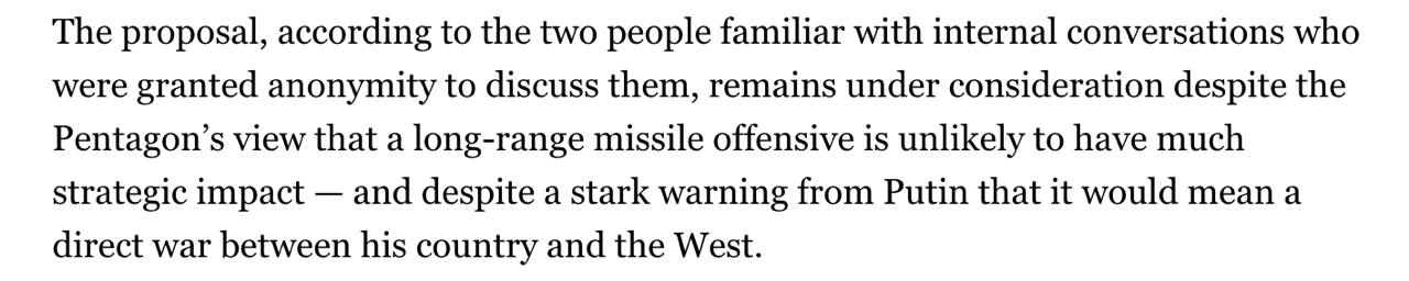 "Несмотря на мнение Пентагона о том, что использование ракет большой дальности для ударов по РФ вряд ли окажет существенное стратегическое воздействие, и несмотря на жесткое предупреждение Путина о том, что это будет означать прямую войну между его страной и Западом", - добавляет издание.